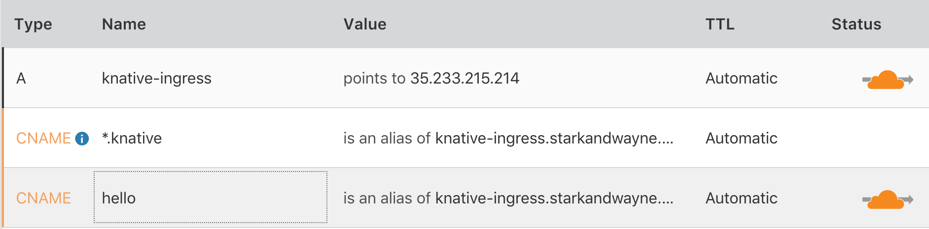 Before we can try out hello.starkandwayne.com or any other custom hostname we need to add a CNAME DNS entry to our ingress gateway: